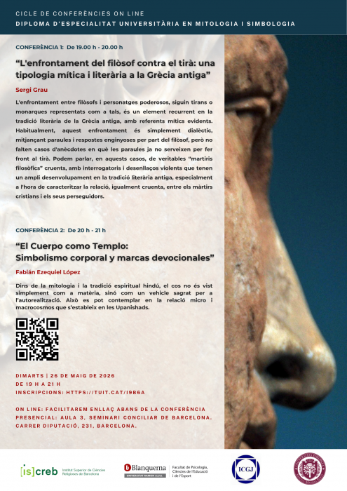 📅 Conferència 1: “L'enfrontament del filòsof contra el tirà: una tipologia mítica i literària a la Grècia antiga”, a càrrec del professor Sergi Grau. 26 de maig, de 19 h a 20 h. La conferència es pot seguir tant presencialment com virtualment.