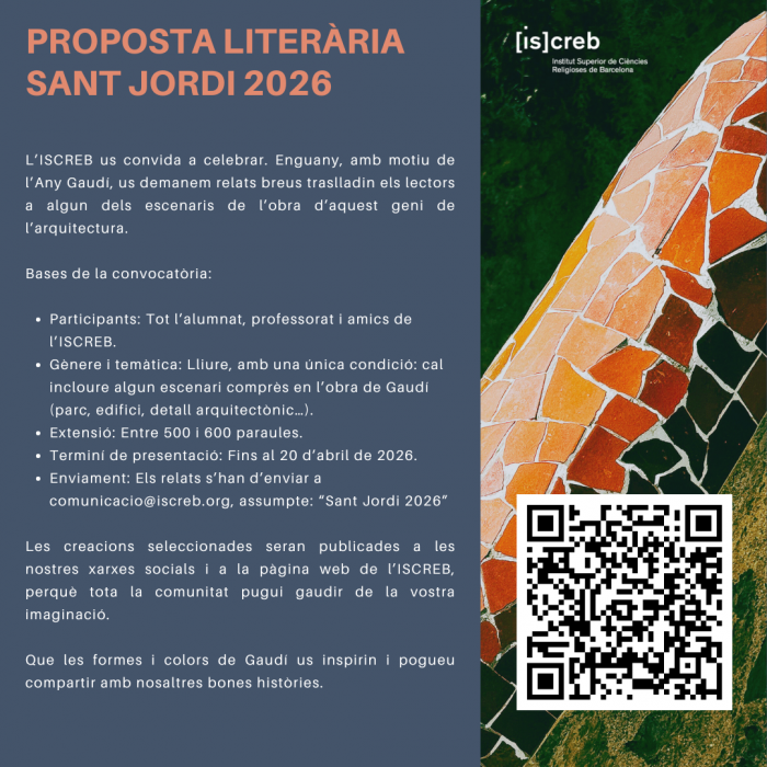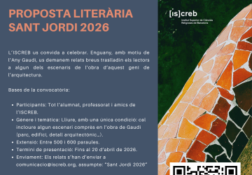 Amb motiu de l’Any Gaudí, l’ISCREB ha convidat tota la seva comunitat a participar en el concurs literari de Sant Jordi 2026 amb una proposta creativa: escriure relats breus que situessin el l ector en algun dels espais de l’obra d’Antoni Gaudí.